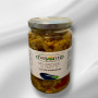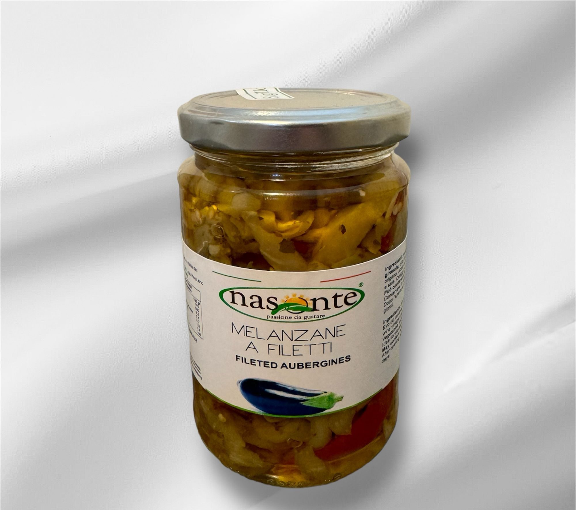 INGREDIENTI : MELANZANE A FILETTI 60%, OLIO DI SEMI DI GIRASOLE, OLIO EXTRA VERGINE DI OLIVA, PEPERONCINO FRANTUMATO 3%, MENTA 2%, AGLIO 2%,ORIGANO 2%, ACETO DI VINO BIANCO E SALE.